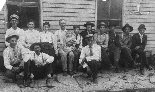 Left to right back row sitting: Clarence McLefresh, Maude McLefresh Fry (half sister of Alvin), Fanny McElfresh Spurlock, Alvin or George McLefresh, child is possibly Forest McElfresh, possibly Alonzo McElfresh, Arthur Spurlock (Fanny's husband), and no idea who the others are in this row. Front row the second from the left looks like William (Bill) Fry (Maude's husband), and no idea who the others are in this row. |