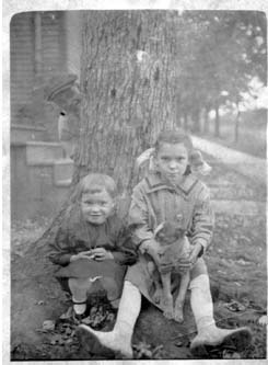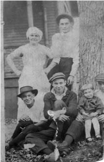 | Samuel McElfresh, son of Fred McElfresh and Rachel King, with his wife Bertha Smallwood and children Harry, Fred, Lewis, and Mary. | Samuel and Bertha's daughters Mary and Inez with Lewis peeking from behind the tree. Photo probably taken circa 1913. |